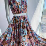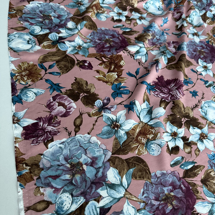 Ніжний фрезово-пудровий фон надає образу елегантності й романтичної індивідуальності, а принт крупних блакитних гортензій додає ефекту вишуканої розкоші. З таким матеріалом літній гардероб стає не просто функціональним, а стильним і натхненним.