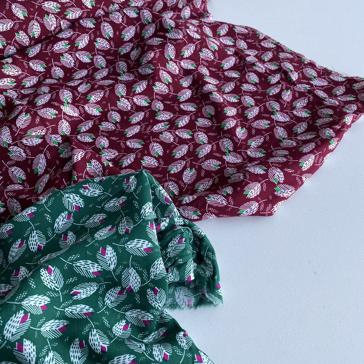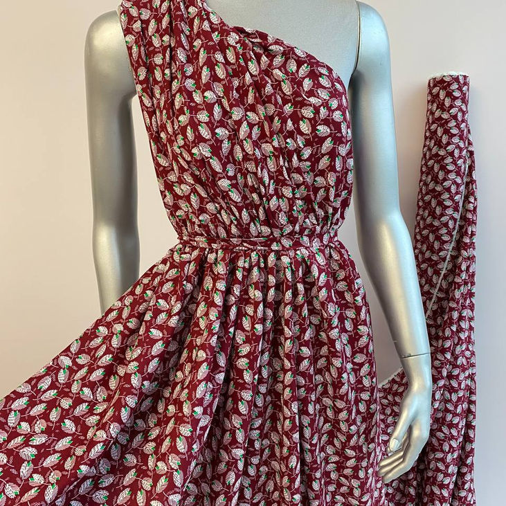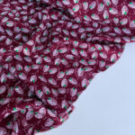 Елегантна та водночас сучасна тканина штапель насиченого бордового кольору з абстрактними листочками — ідеальний вибір для стильного літнього чи демісезонного одягу. Дизайн поєднує глибину кольору з м’якими природними формами, що створює візуальний акцент без надмірної яскравості.
