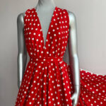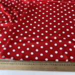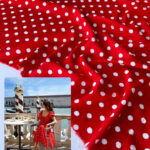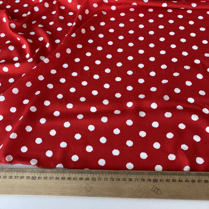 Насичено червоний штапель з білими колами нерівної форми розміром 1×1 см – це поєднання яскравого кольору та нестандартного геометричного дизайну. Така тканина чудово підходить для створення сучасного, стильного одягу з характером.
