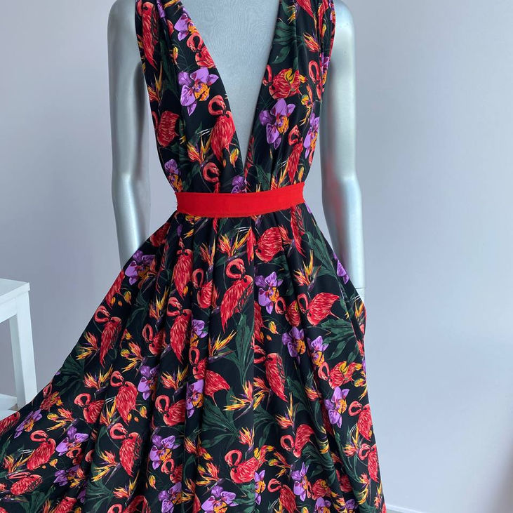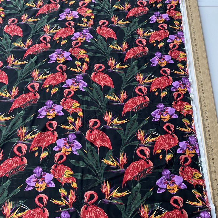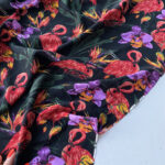 Будьте першим, хто залишив відгук на “Тканина штапель чорний з фламінго і тропічними квітами”