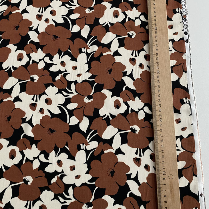 Великий чорно-білий квітковий орнамент на теплому коричневому фоні виглядає ефектно й водночас стримано.Завдяки глибокому кольору тканина легко поєднується з аксесуарами в базових відтінках: беж, білий, чорний, кавовий, цегляний.