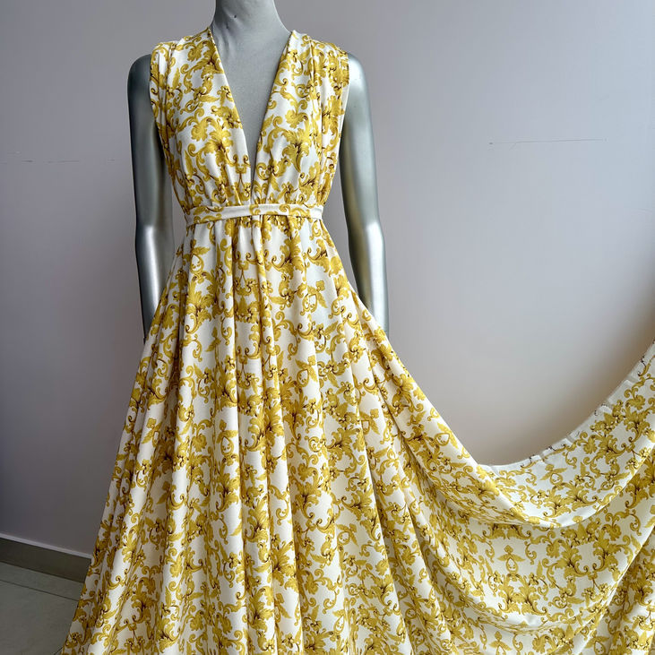 Переваги тканини: має легку й текучу структуру, яка м’яко лягає по фігурі, формуючи драпіровки та красиві складки. Тканина не прозора.