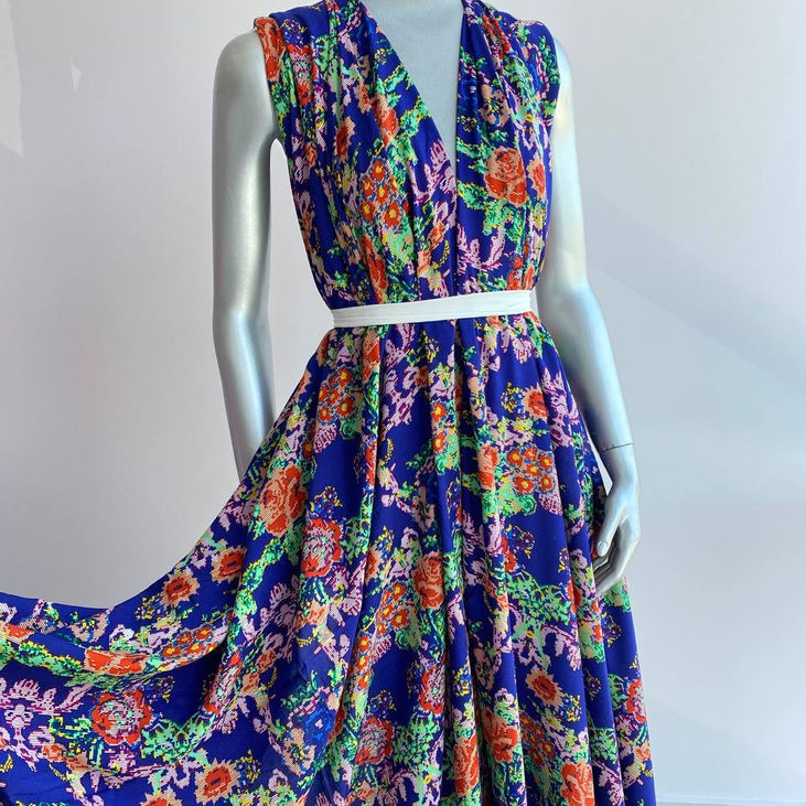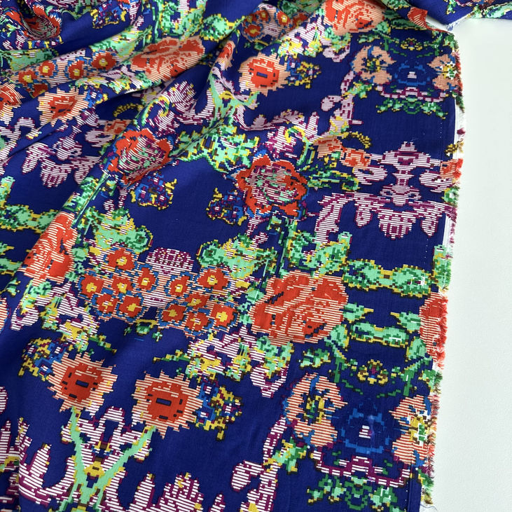 Неповторна тканина штапель яскраво-синього кольору з помаранчево-зеленими квітами, виконаними у стилі вишивки, стане справжньою родзинкою вашого гардеробу.