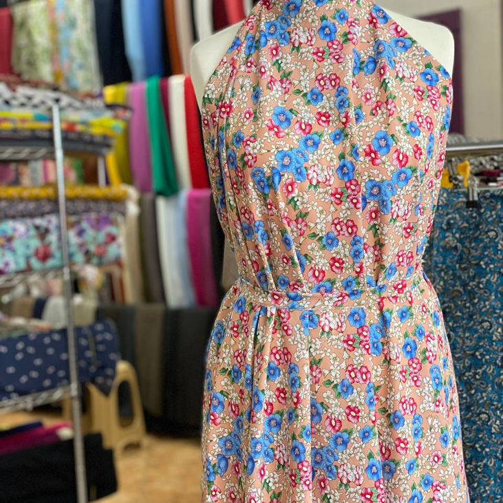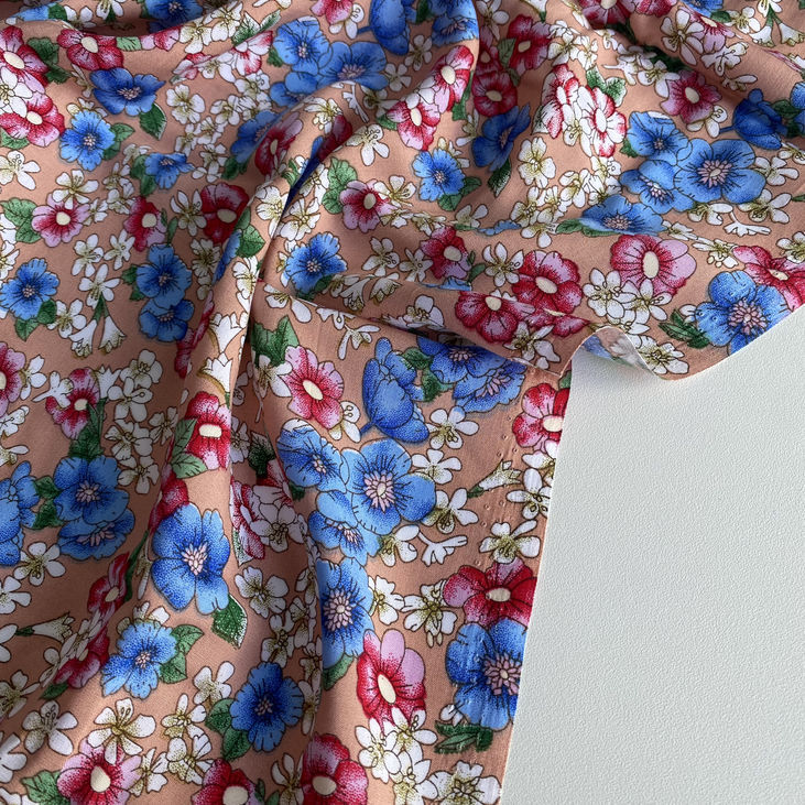 Блакитні незабудки, розсипані по бежево-персиковому тлу. Поєднання ніжних тонів із витонченим квітковим принтом пробуджує відчуття спокою, тепла і витонченості.