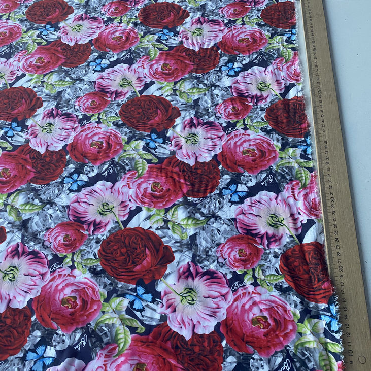 Стильна та виразна тканина штапель з червоно-рожевими квітами й білими написами на чорному фоні – чудовий вибір для створення ефектного літнього одягу. Поєднання ніжної флористики з графічними елементами робить цю тканину унікальною та сучасною.