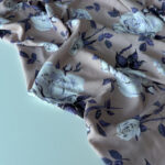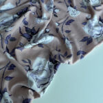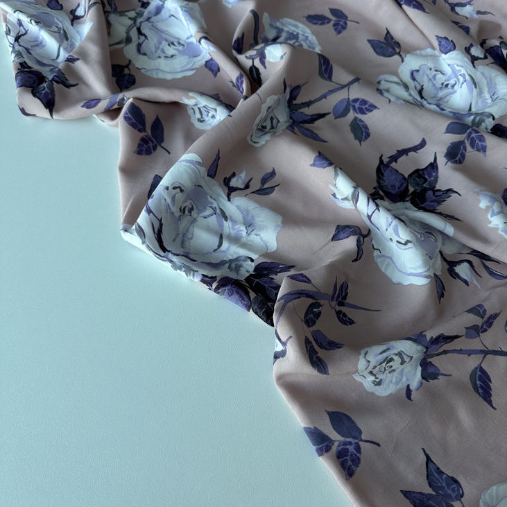 Ніжна й елегантна тканина штапель з великими фіолетовими трояндами на пудрово-фрезовому фоні — ідеальний вибір для створення романтичного літнього одягу.