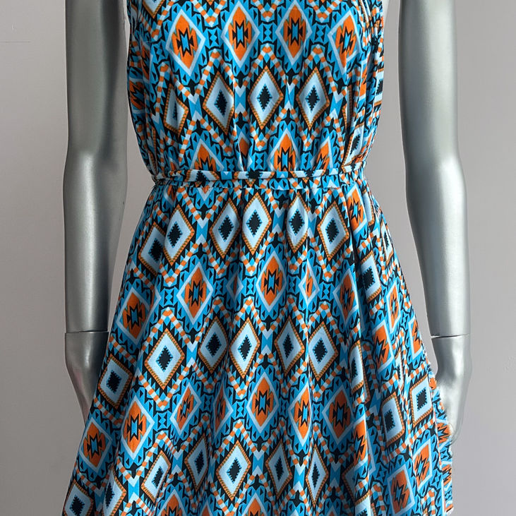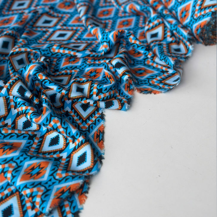 — сміливий акцент для літнього гардеробу. Тканина поєднує насичений бірюзовий фон з великими геометричними ромбами помаранчевого кольору, створюючи ефектний контраст. Ідеальна для створення стильних літніх образів, вона привертає увагу та додає енергії кожному виробу.