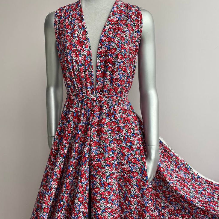Насичений дрібний принт — червоно-блакитні квіточки створюють візуальну глибину й енергію