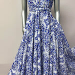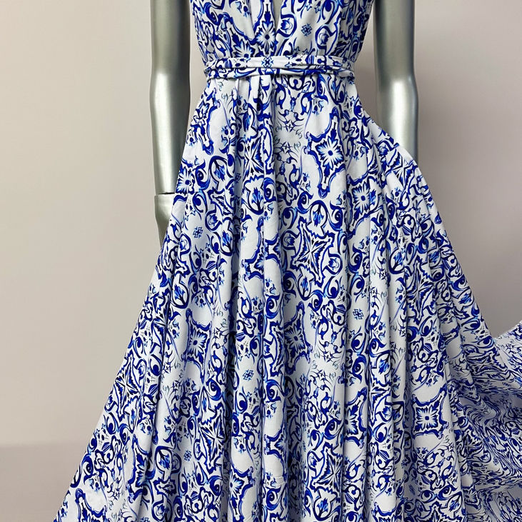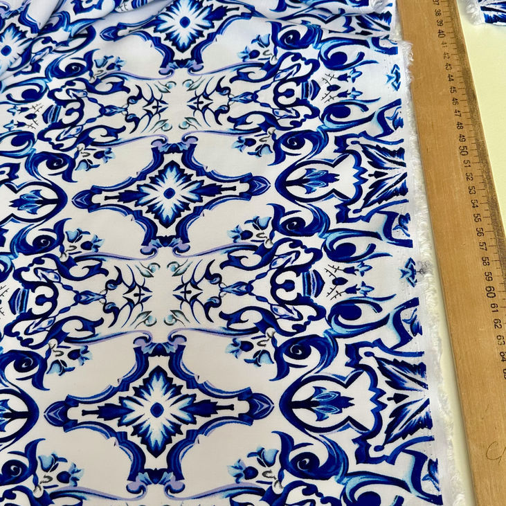 Легка, м’яка й комфортна тканина штапель з вишуканим синім принтом у стилі азулежу на білому фоні – чудовий вибір для створення елегантного літнього одягу.