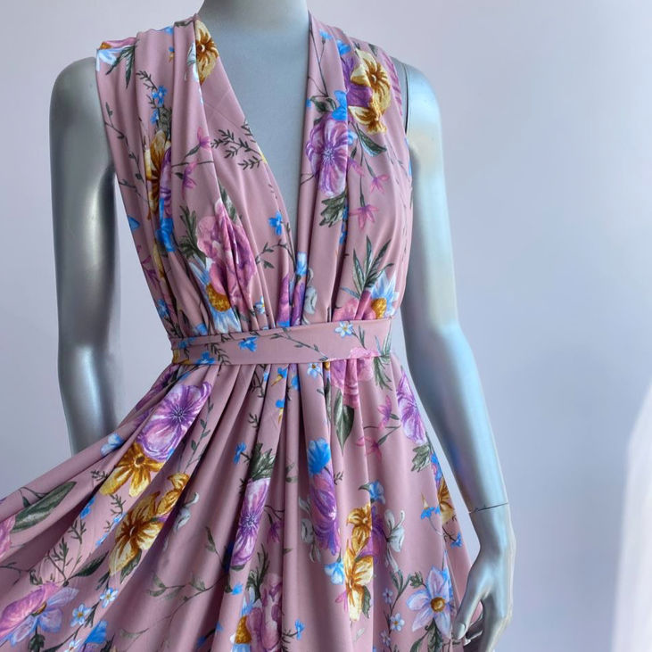 — легка та повітропроникна тканина з м’якою текстурою, яка ідеально підходить для створення жіночного та яскравого одягу. Ніжно-сиреневий фон гармонійно поєднується з виразними блакитно-жовтими квітковими мотивами, надаючи виробам свіжості, романтичності та стилю.