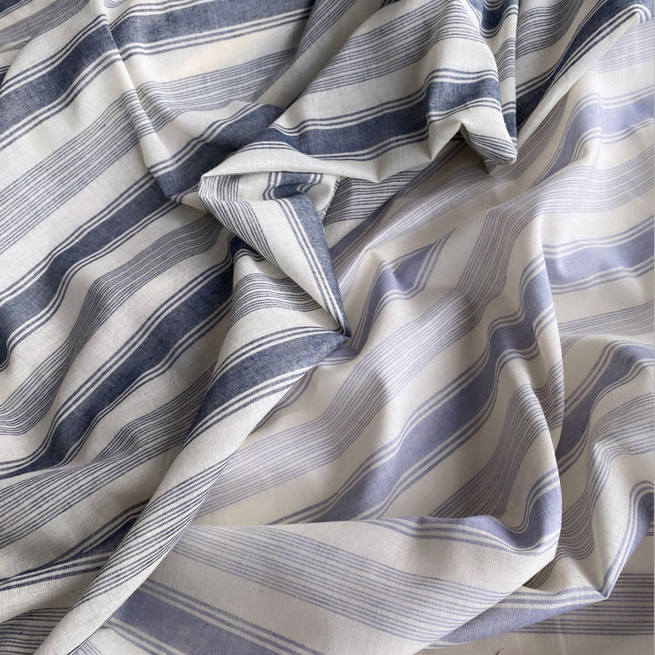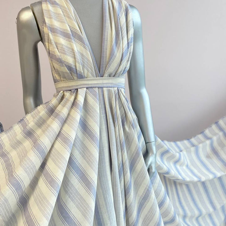 На полотні витончено проходять меланжеві смуги ніжного блакитного кольору — широкі (2 см) і дуже тонкі (1–2 мм).