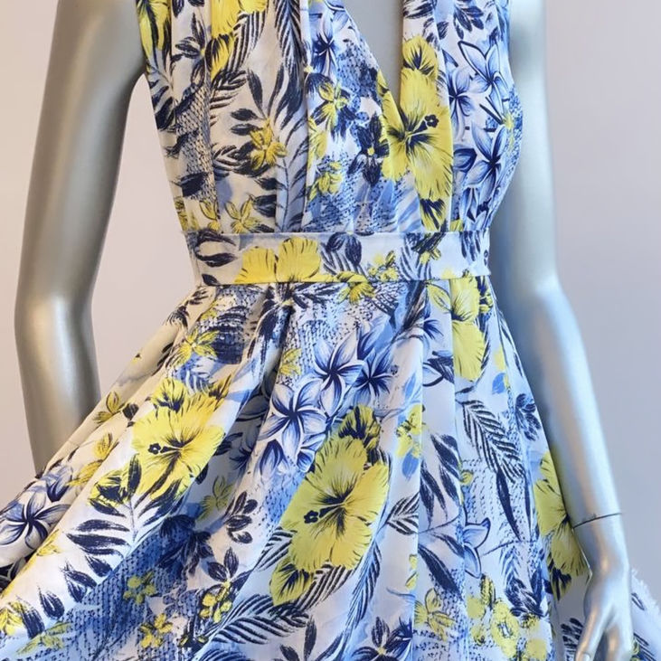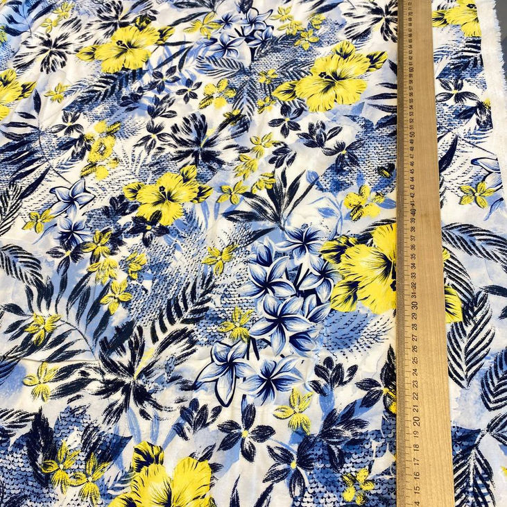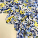 Стильний абстрактний квітковий принт — поєднання блакитно-синіх акцентів і яскравих жовтих плям на білому тлі робить тканину ексклюзивною та освіжаючою.