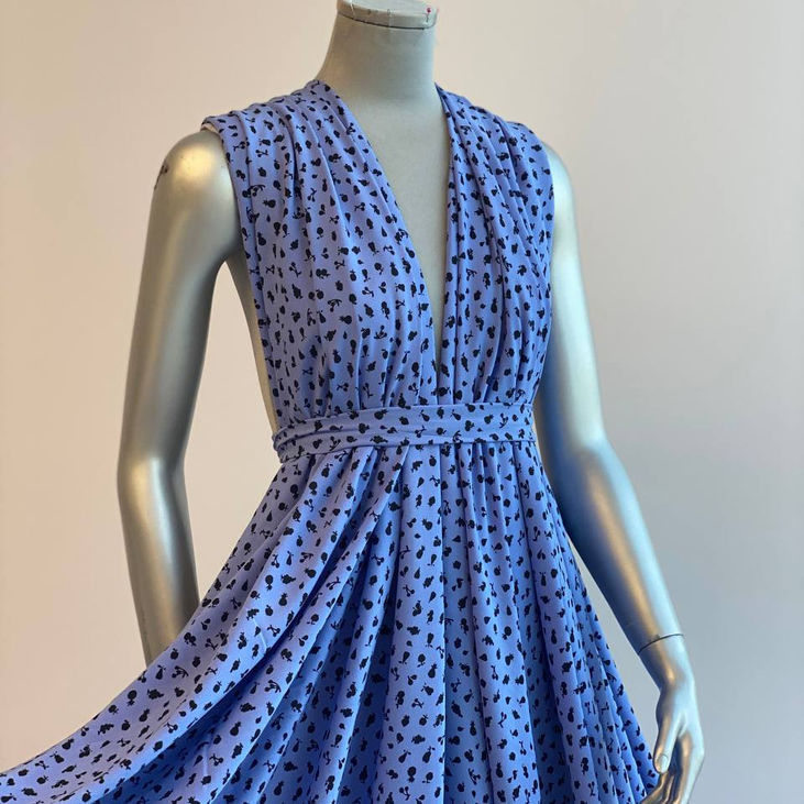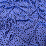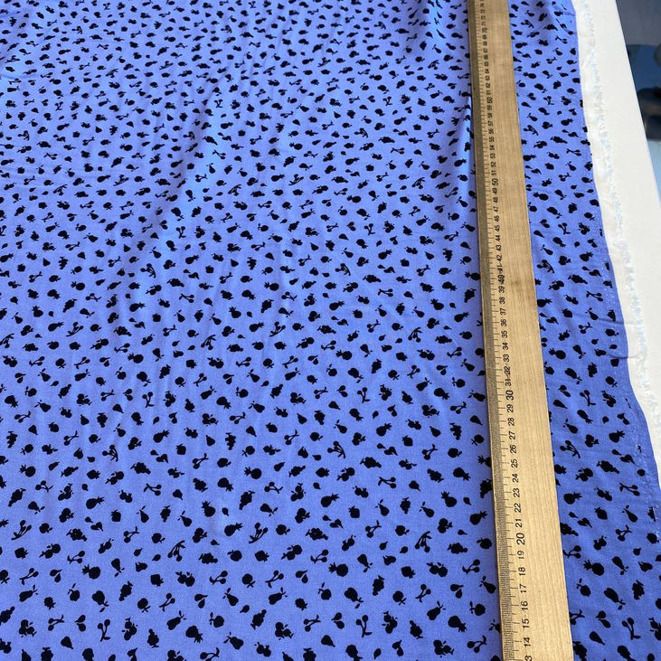 — ніжність і легкість у кожному метрі. Стильна італійська віскозна тканина ніжного лавандового відтінку з делікатним принтом дрібних чорних фруктів, що додає виробам легкості та особливого шарму.