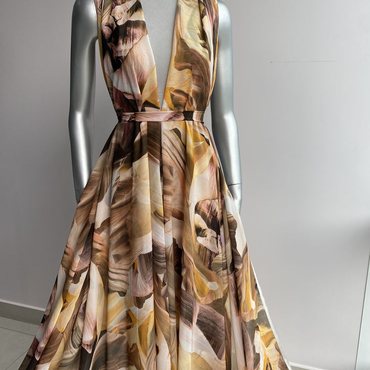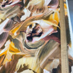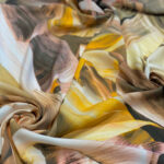 — тепла акварель у натуральних тонах . Елегантна італійська віскоза з художнім абстрактним акварельним принтом у стилі «Сахара» — плавні переходи бежево-коричневих відтінків створюють ефект природної текстури піску, скель і спеки.
