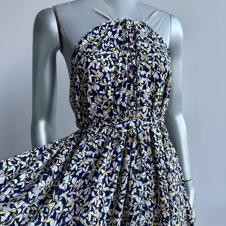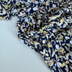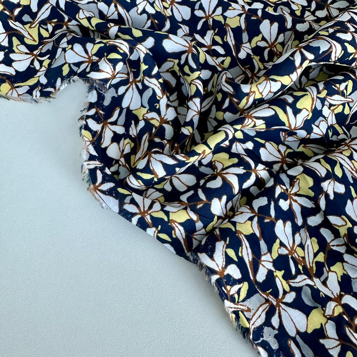 Темно-синій фон надає глибини, а квітковий візерунок у жовто-біло-сірих тонах із тонким коричневим контуром додає шарму й стриманої романтики. Це тканина для тих, хто цінує витончену класику з ноткою італійського шарму.