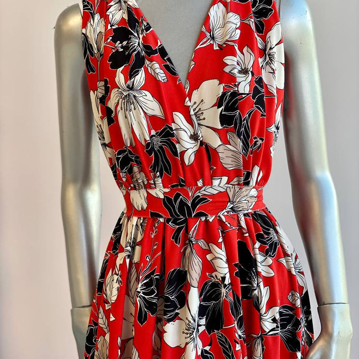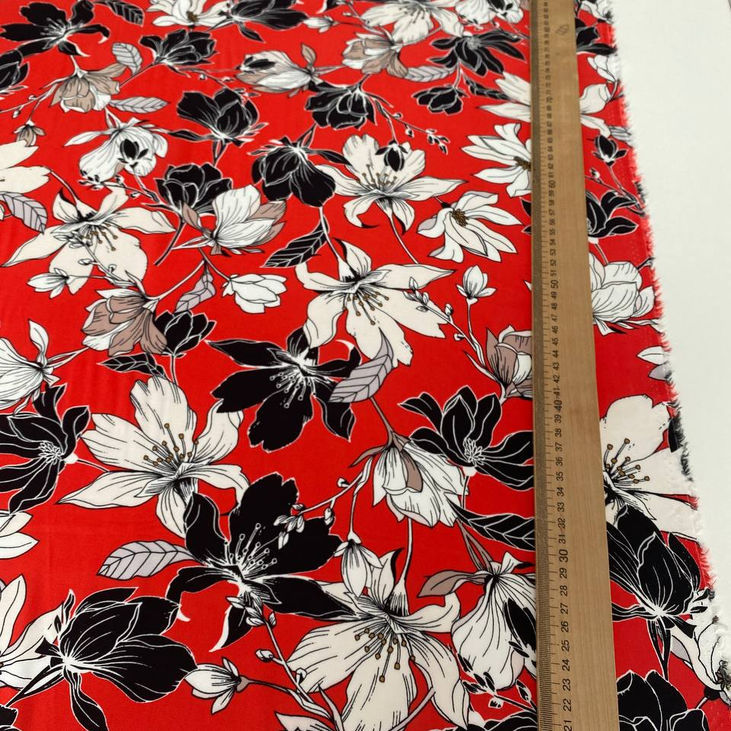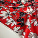Смілива й ефектна віскоза твіл червоно-алого кольору з великими білими та чорними графічними квітами — це тканина для тих, хто любить виразність, стиль і комфорт.