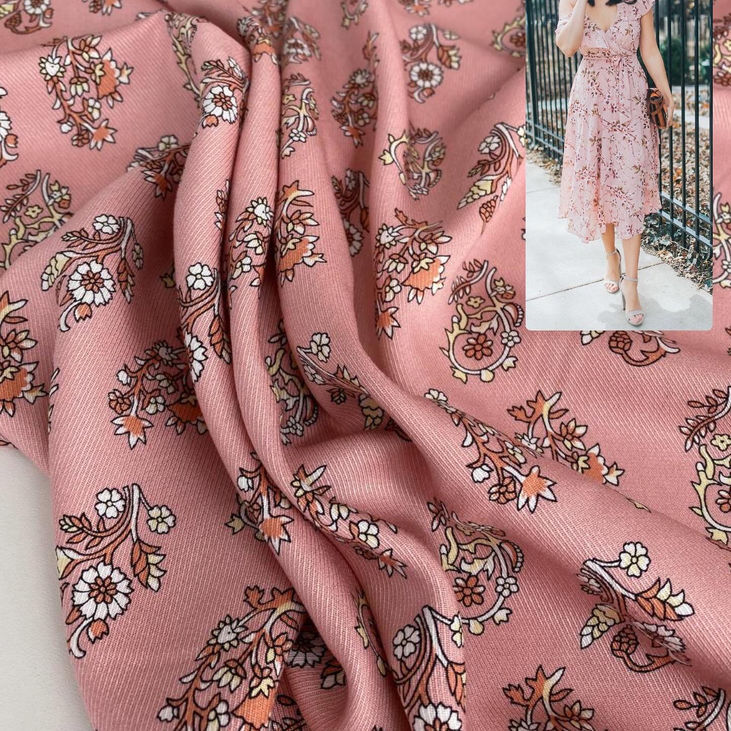 Ніжна та стильна віскоза твіл фрезового (рожево-пудрового) кольору з коричнево-білим візерунком — це тканина, яка поєднує елегантність, комфорт і трендовий вигляд.