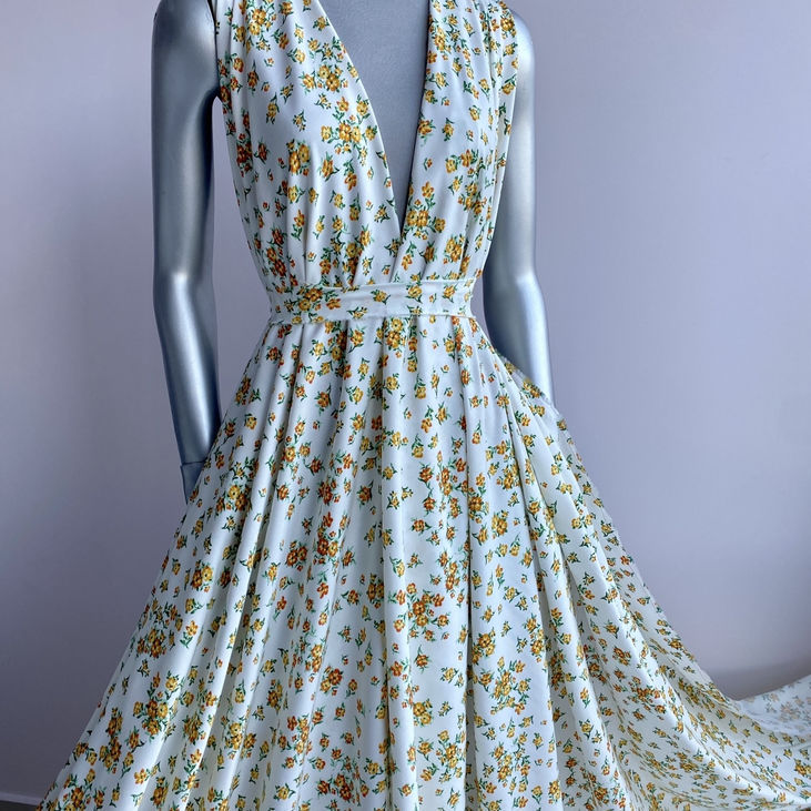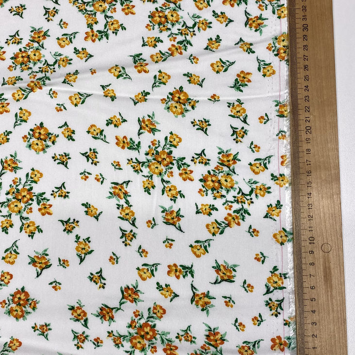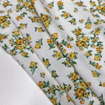 Її білий фон прикрашено делікатним розсипом жовтих квіточок та зелених листочків, які створюють ніжний флористичний орнамент. Такий візерунок надає виробам особливого шарму, ненав’язливої романтики та легкого ретро-настрою.