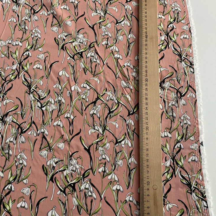 Її пудрово-рожевий відтінок створює ніжний, романтичний настрій, а делікатний флористичний візерунок із пролісками та зеленими листочками додає тканині свіжості й природної краси.