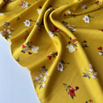 Будьте першим, хто залишив відгук на “Віскоза твіл рідко розташовані букетики червоно-жовто-біли квітів на гірчично-жовтому фоні”
