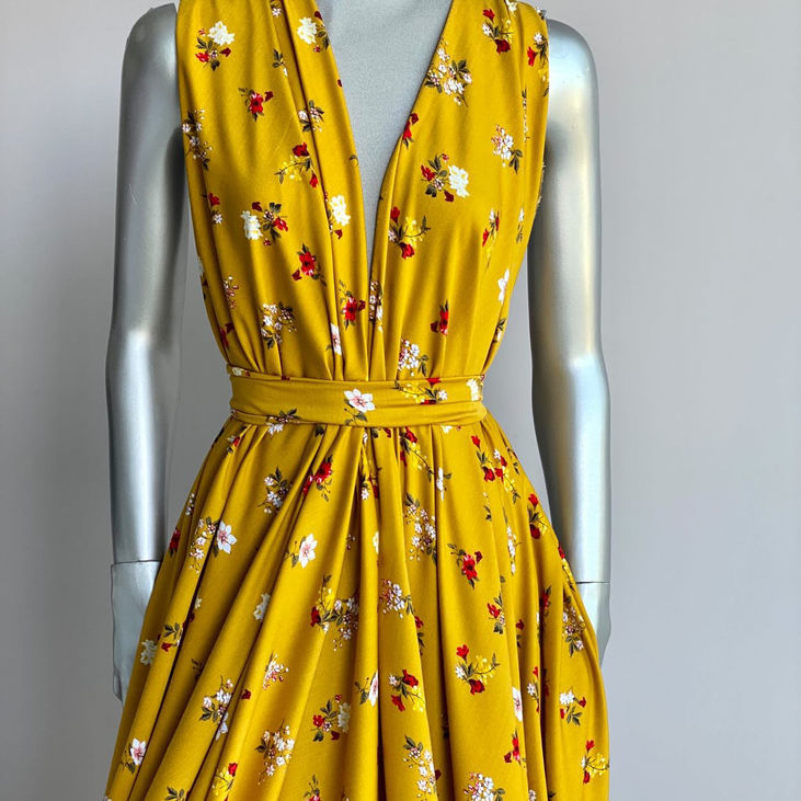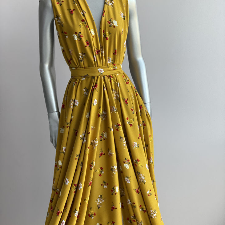 Гірчично-жовтий фон додає теплоти та настрою сонячного літа, а рідко розташовані квіткові букетики в червоно-жовто-білих тонах дарують романтичну ноту.