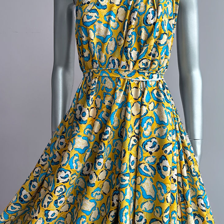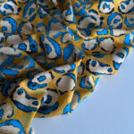Жовто-гірчичний фон гармонійно поєднується з абстрактними фігурами у відтінках блакитного, синього та бежевого, створюючи виразний і стильний принт, що ідеально підходить для індивідуального, модного одягу.