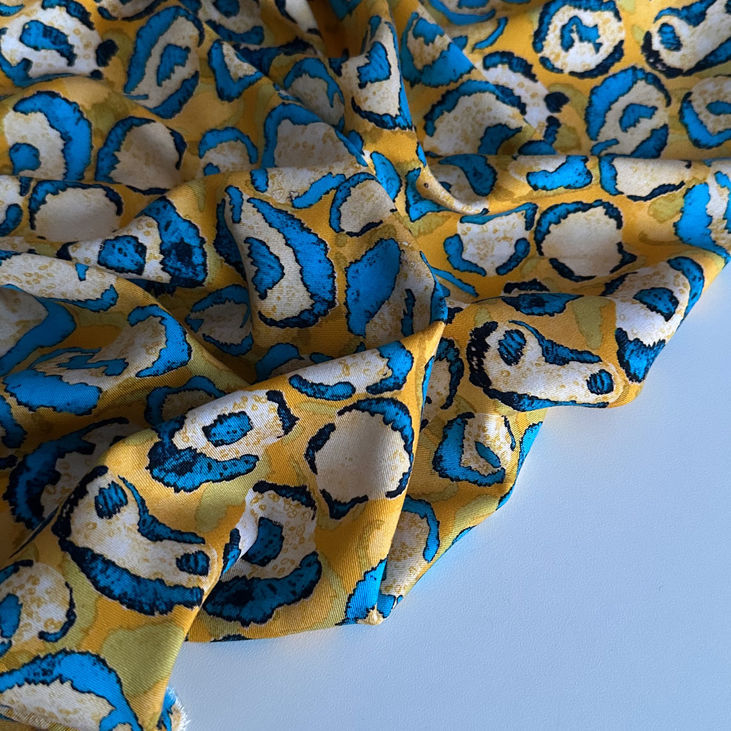 Віскоза твіл жовто-гірчична з абстракцією у блакитно-синьо-бежевих тонах