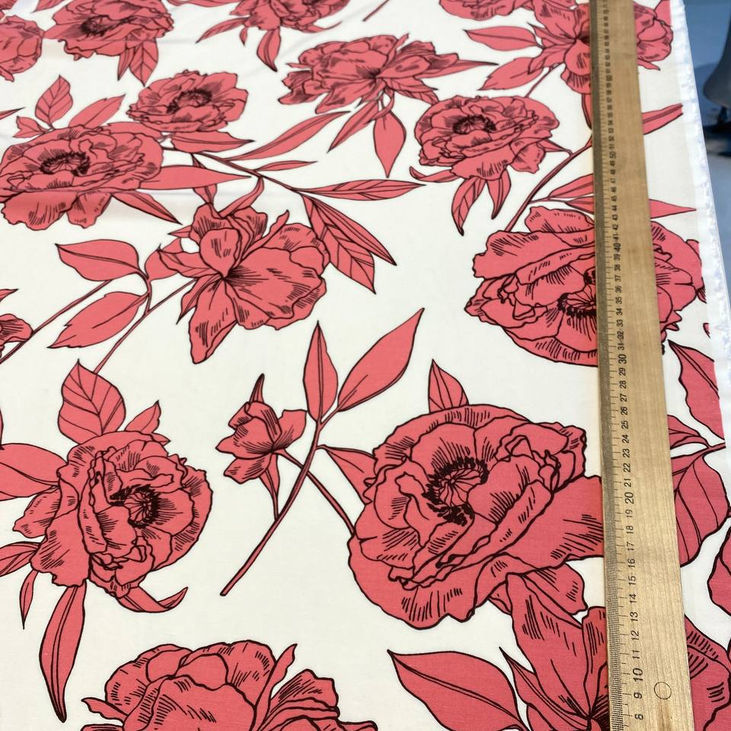 Стильна віскозна тканина з льняною фактурою, прикрашена великими рожевими маками на ніжному біло-молочному фоні — вдале поєднання натурального вигляду та комфортного носіння.