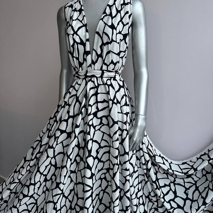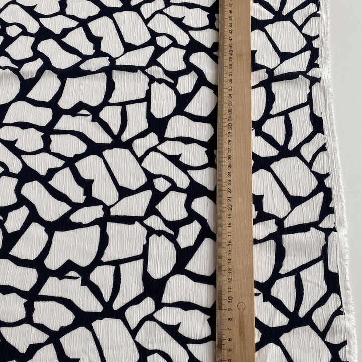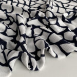 – легка тканина з характером. Оригінальна віскоза жата з ефектом злегка пом’ятої текстури, виконана в темно-синьому кольорі з абстрактним білим принтом у стилі “жираф” — це стильне рішення для модного повсякденного або дизайнерського одягу.