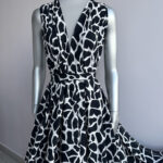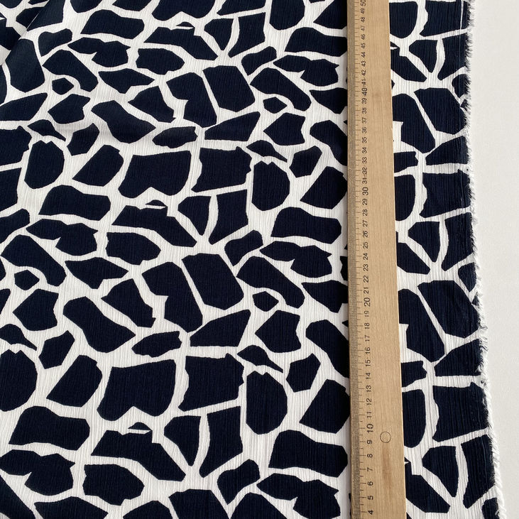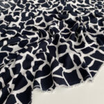 Легка, струмлива віскоза жата з оригінальним абстрактним принтом у стилі “жираф” темно-синього кольору на білому фоні – ідеальний варіант для літнього або міжсезонного гардеробу.