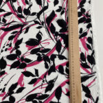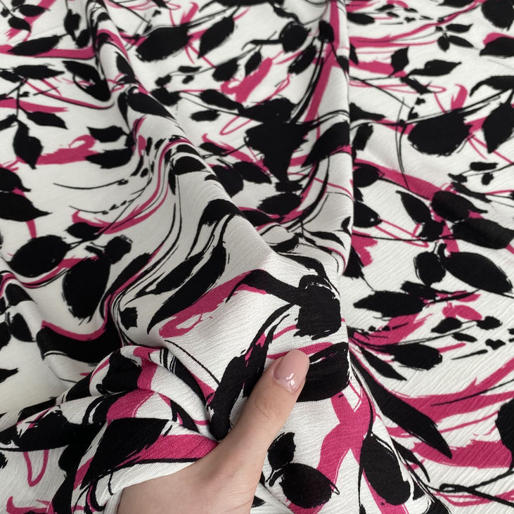 Стильна віскоза жата з білосніжною основою, доповненою вертикальними малиновими лініями та графічними чорними квітами — це сміливе й витончене рішення для тих, хто хоче створити виразний, але легкий образ. Такий принт виглядає стримано, але з характером, чудово підходить для сучасного міського стилю.