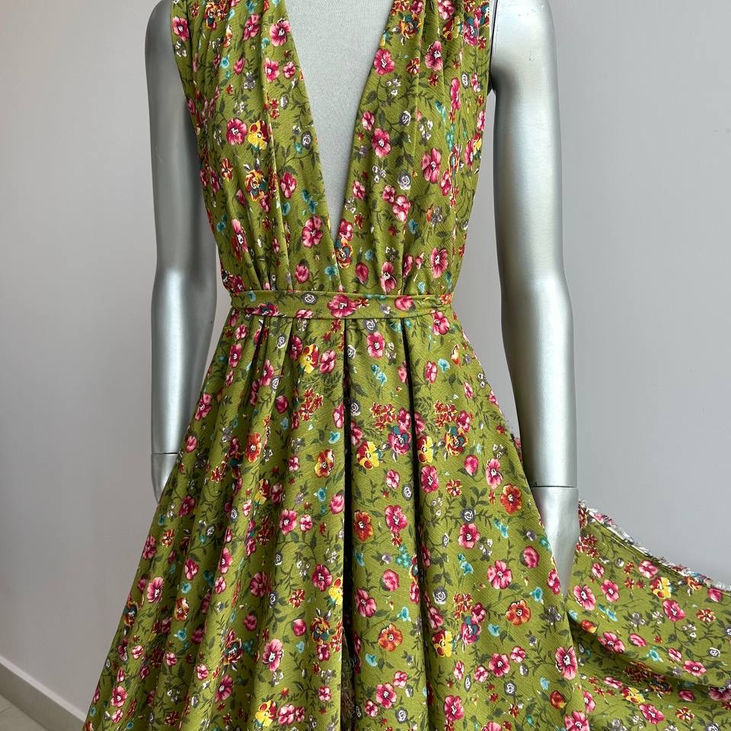 Зеленкувато-оливковий відтінок цієї тканини навіює асоціації з прохолодною тінню саду, де розквітають ніжні польові квіти. Візерунок із дрібними бутончиками створює витончену текстуру, яка ніби оживає на тлі делікатно жатої поверхні.