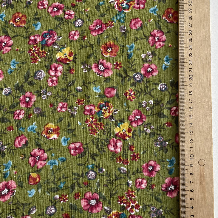 Віскоза жата з мілкими квітами на зеленкувато-оливковому фоні