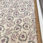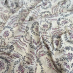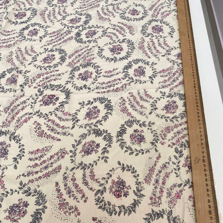 Ніжна і легка віскозна тканина крепдешин італійського виробництва у благородному молочно-бежевому відтінку, прикрашена тонкими ліловими квіточками та витонченим сірим листям.