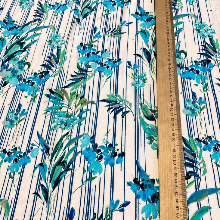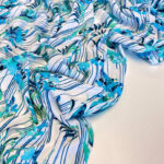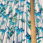 Віскозний крепдешин Італія з бірюзово-синім листям і смужками на білому фоні у стилі Зіммерман