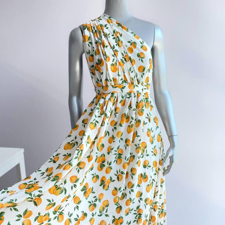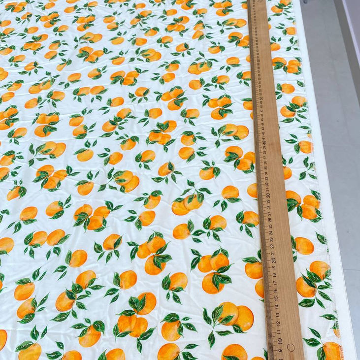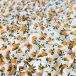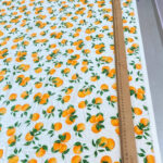 Купити віскозний крепдешин з Італії з апельсиновим принтом на білому фоні можна з доставкою по всій Україні — для модниць і дизайнерів, що цінують якість і стиль.