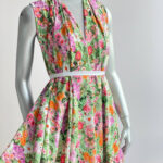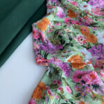 Ніжний віскозний льон світло-салатового відтінку, прикрашений делікатним квітковим принтом у рожевих та помаранчевих тонах з зеленим листям. Ця тканина ідеальна для створення легких, повітряних літніх суконь, блуз та аксесуарів.