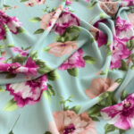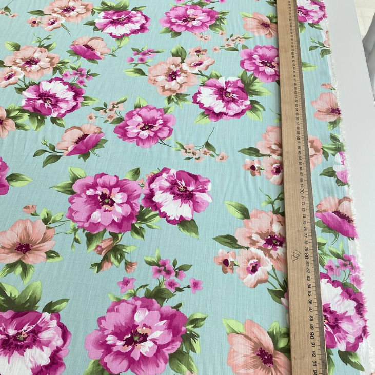 Будьте першим, хто залишив відгук на “Віскозний льон пастельного відтінку світлий тіффані з крупними рожемими півоніями і зеленим листям”