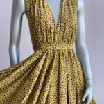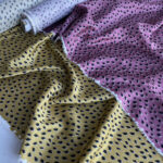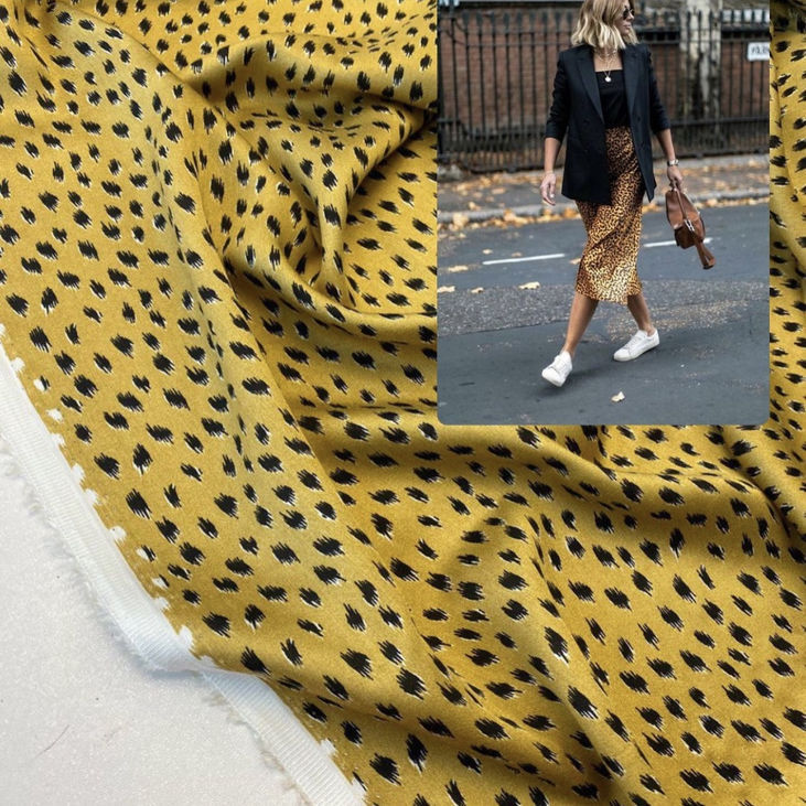 Тканина віскозний шовк поєднує в собі натуральну основу з витонченою шовковою фактурою. Її гірчичний колір, насичений і теплий, чудово відтіняється чорними цятками, що створюють ефект анімалістичного принту у стилі “лео”.