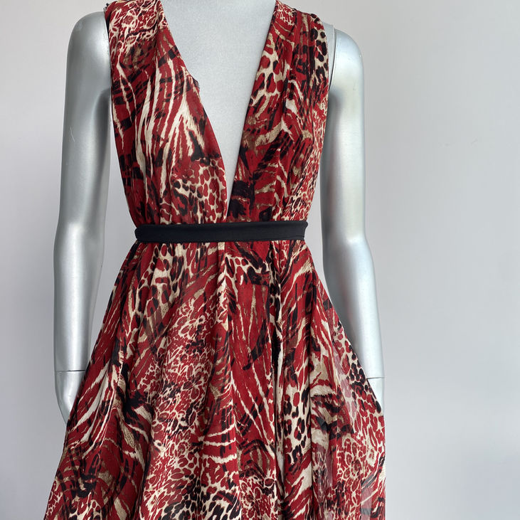 Особливої уваги заслуговує принт: глибокий бордовий поєднується з бежевими нотками у стилізованому анімалістичному дизайні. Це не агресивний леопард, а скоріше м’яка італійська інтерпретація wild-мотивів — делікатна, жіночна, модна. Такий малюнок гарно виглядає як у повсякденних луках, так і в більш ошатних образах.