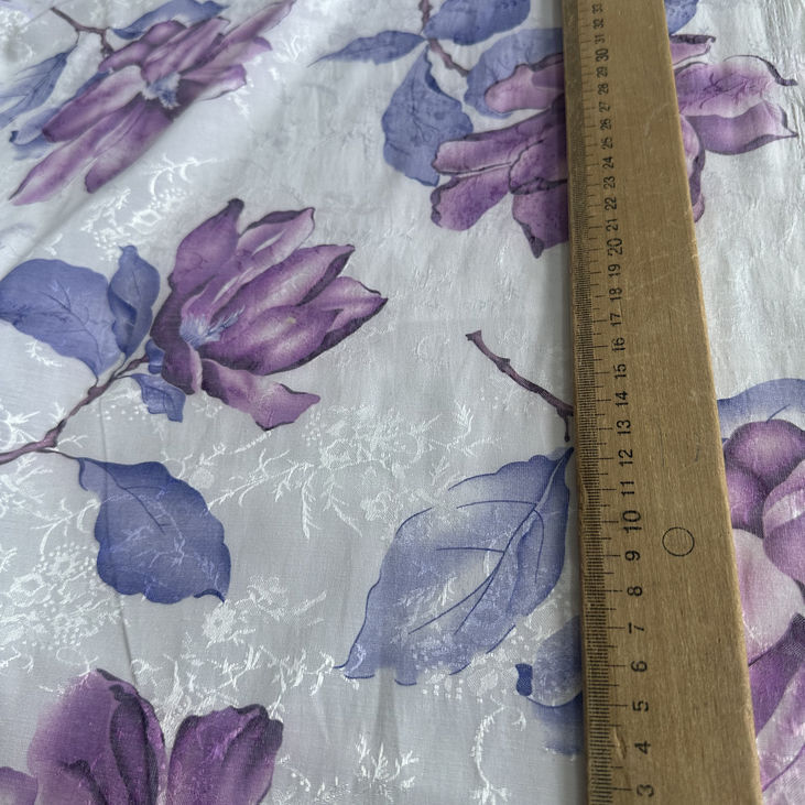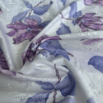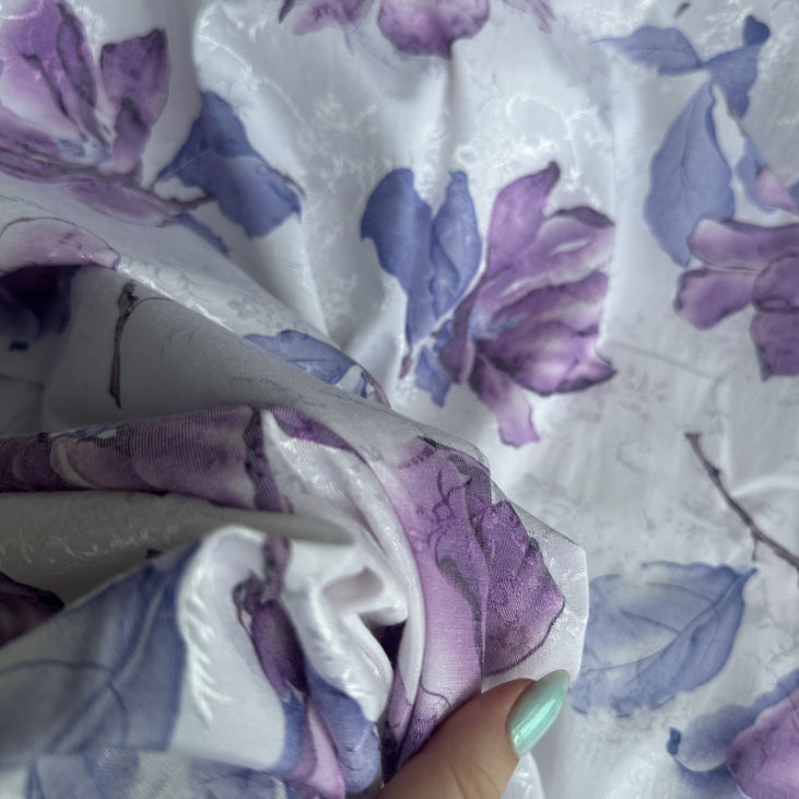 Цей вишуканий жакард поєднує чистоту білого фону з елегантністю крупних квітів у пастельних відтінках фіолетового та сиреневого. Об’ємна текстура тканини надає малюнку глибини та виразності, створюючи стильний і ніжний образ.