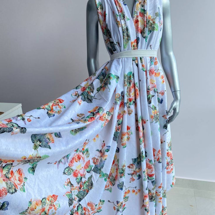 Об’ємна текстура тканини додає глибини малюнку, роблячи його виразним і водночас витонченим. Ідеальний для створення легких, природних образів із нотками елегантності.